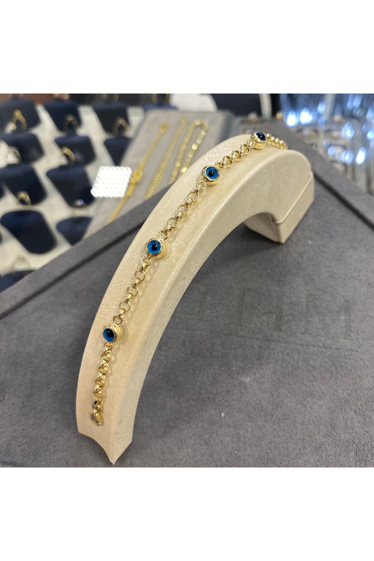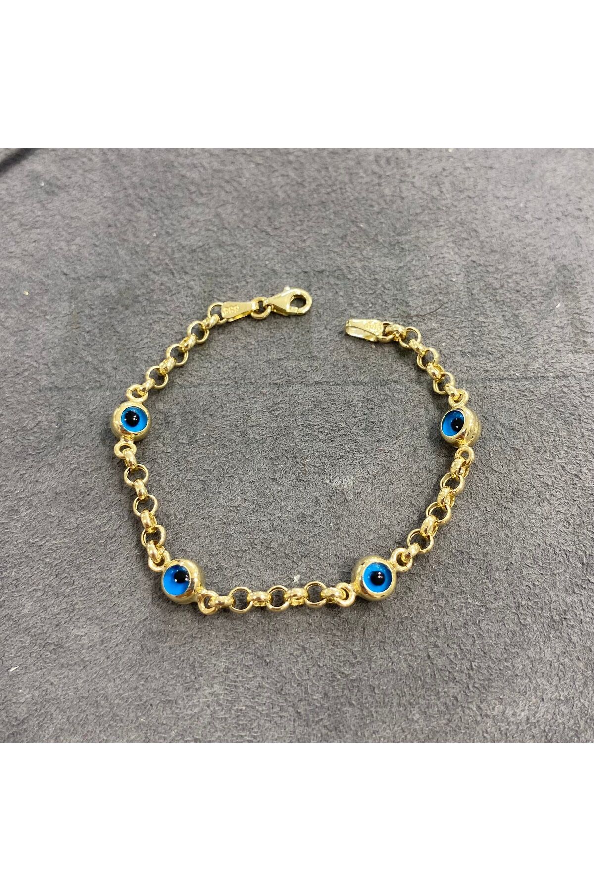 - 14 ayar altın malzemesiyle üretilmiş, uzun ömürlü ve kaliteli bir aksesuar.; - Nazar boncukları ile süslenmiş tasarımı, çocukların enerjisini korumak için özel bir dokunuş katıyor.; - Hem kız hem de erkek çocuklar için uygun unisex tasarımıyla herkesin beğenisine hitap ediyor.; - Çocukların bileklerine özel olarak tasarlanmış, rahat ve konforlu bir kullanım sunuyor.;